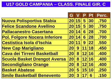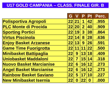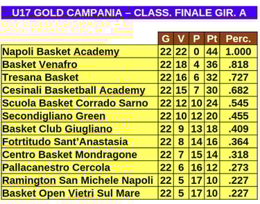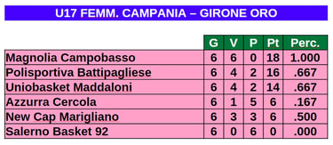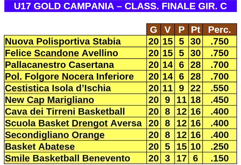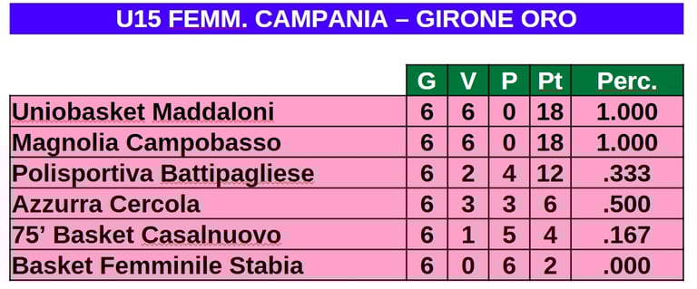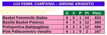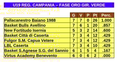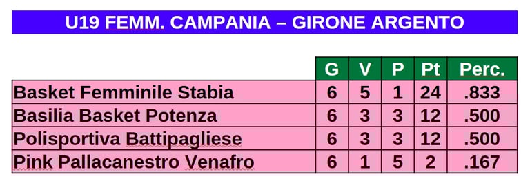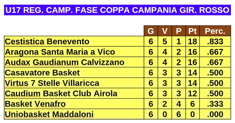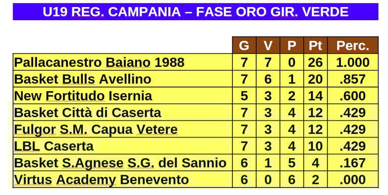 Al termine della prima fase è stata stilata una classifica generale fra tutte le squadre dei tre gironi. La Basket Venafro, forte del suo secondo posto nel girone A, si trova in quinta posizione in questa classifica, mentre la New Minibasket Isernia è ultima, essendo l'unica squadra a non aver mai vinto nei tre gironi. In virtù di questo, i venafrani saltano il primo turno dei playoff e vanno direttamente agli ottavi di finale, mentre gli isernini giocano il primo turno ad eliminazione diretta della Coppa Campania contro la Angel Basket Marcianise, con gare di andata e ritorno dopo le quali passa al turno successivo il quintetto con la migliore differenza canestri (o quoziente canestri, in questo caso è la stessa cosa) nelle due partite. In gara1, Isernia ha battuto Marcianise col punteggio di 66-52 e quindi dovrà difendere in gara 2 questi 14 punti di vantaggio in gara 2, in programma il prossimo 12 aprile. Ve ne daremo contro nel prossimo aggiornamento..