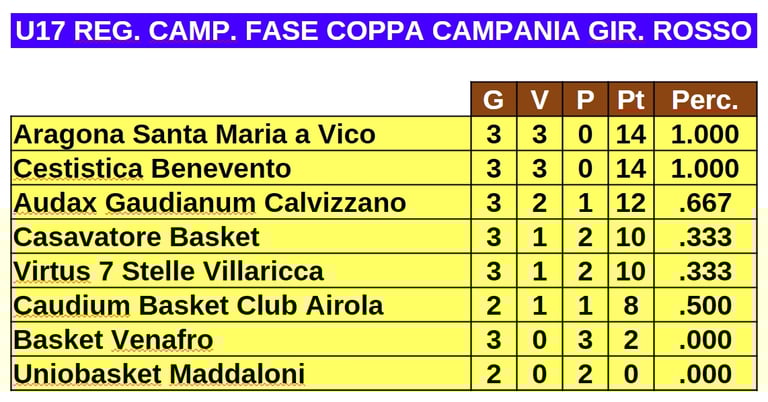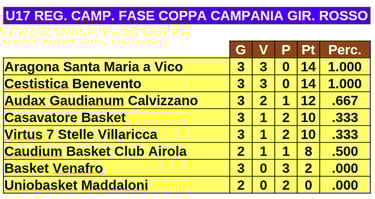 Le classificate dal quinto all'ottavo posto di tutti i gironi partecipano alla fase Coppa Campania conservando i punti conquistati negli scontri diretti. Le squadre provenienti dai gironi A e B formano il girone rosso, del quale vedete la classifica ad oggi nell'immagine qui di seguito.