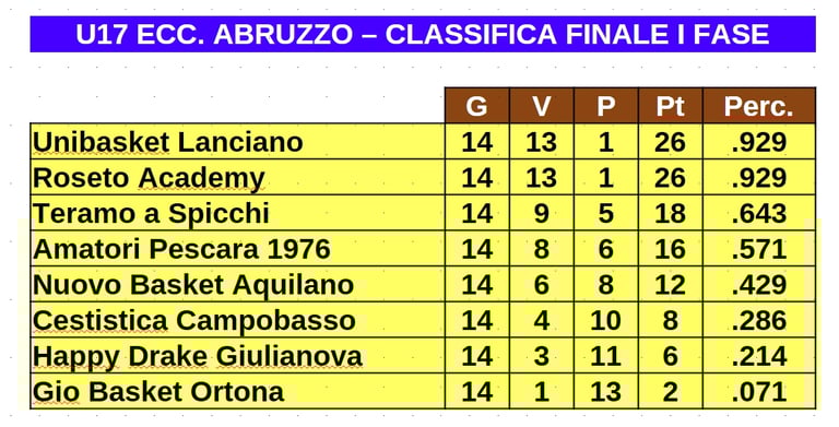 Al termine della prima fase, le otto squadre hanno partecipato ai playoff. Alla Cestistica Campobasso è toccata la sfida contro il Termo a Spicchi, vinta dagli abruzzesi con i i risultati di 66-62 per Campobasso in gara1 e 68-57 per Teramo in gara 2. La vincitrice dei playoff è stata l'Unibasket Lanciano, ammessa alla fase nazionale insieme alla Roseto Academy, sconfitta in finale playoff. Le altre sei squadre partecipano alla fase coppa Abruzzo, della quale qui di seguito vedete la classifica dopo la prima giornata, l'unica finora disputata..