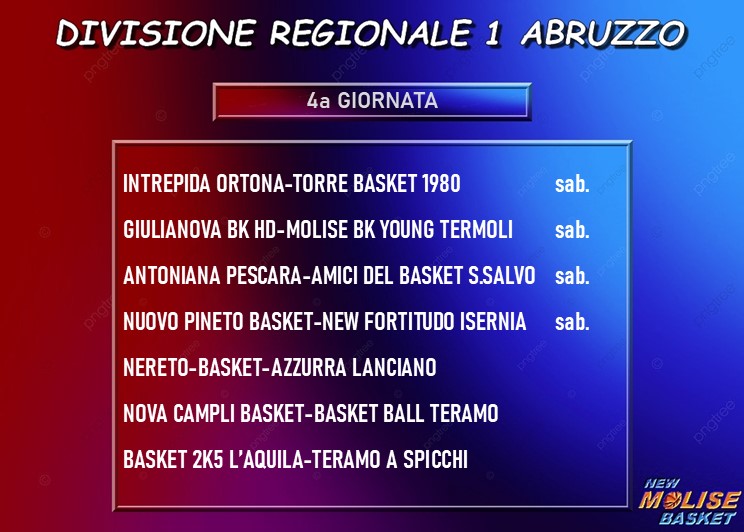 Turno importante per la testa della classifica, con le quattro squadre al comando che “si incrociano” nei due big match che ridurranno a due le capolista dopo la quarta giornata; Nereto-Lanciano e Campli-Basket Ball Teramo si giocano entrambe domani e daranno una buona indicazione su quali saranno le pretendenti al salto di categoria quest’anno. Trasferta per San Salvo, che viaggia verso Pescara, chiudono il quadro degli incontri in programma i match fra Ortona e Torre e fra L’Aquila e Teramo a Spicchi.