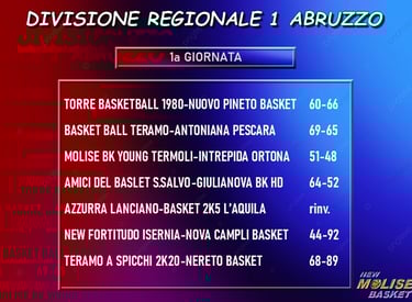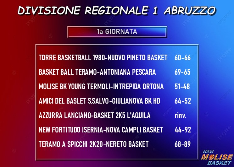 Si conclude col bilancio di una vittoria e una sconfitta per le squadre molisane la prima giornata del torneo di Divisione Regionale 1. ILa vittoria è quella della Molise Basket Young Termoli, che supera allo sprint l'Intrepida Ortona, la sconfitta, invece, tocca alla New Fortitudo Isernia, largamente battuta davanti al proprio pubblico dalla Nova Basket Campli.