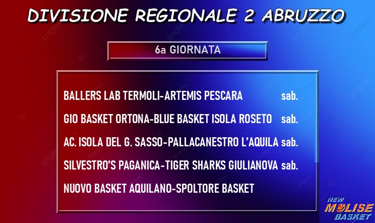 L’incontro clou della sesta giornata sembra essere quello che mette di fronte la prima in classifica ad una delle tre seconde: Giulianova, infatti, è impegnata sul campo del Paganica ed interessante è anche il match fra Nuovo Basket Aquilano e Spoltore, mentre l’ultima componente il terzetto delle inseguitrici alla capolista, il Blue Basket Isola Roseto, andrà a giocare ad Ortona con i favori del pronostico. L’ultimo match in programma è quello fra Academy Isola del Gran Sasso e Pallacanestro L’Aquila.