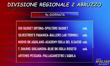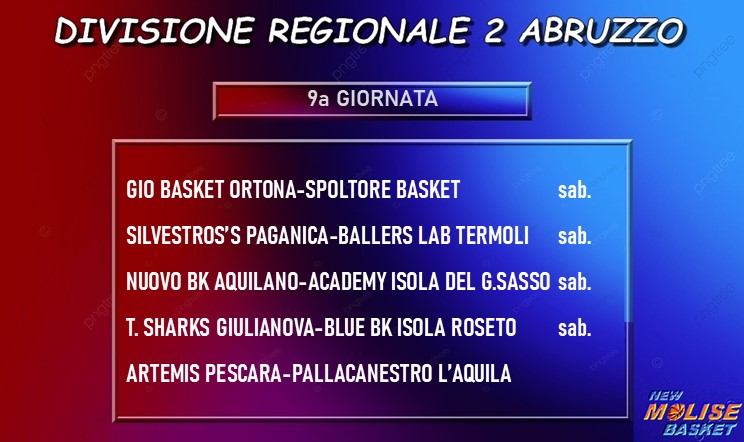 Le altre due prime della classe sono impegnate in trasferta, precisamente Spoltore sul campo del Gio Basket Ortona e Blue Basket Isola Roseto a Giulianova in un altro match che si presenta abbastanza equilibrato. Pronostico piuttosto chiaramente a favore della squadra di casa, invece nella gara fra Nuovo Basket Aquilano e Academy Isola del Gran Sasso, chiude il quadro degli incontri in programma Artemis Pescara-Pallacanestro L’Aquila. Dopo la disputa di quest’ultimo turno del girone di andata, il calendario prevede un fine settimana di riposo, ma fra sabato e domenica prossimi verranno giocati tutti i match di recupero, dei quali vi daremo conto non appena avremo i risultati.