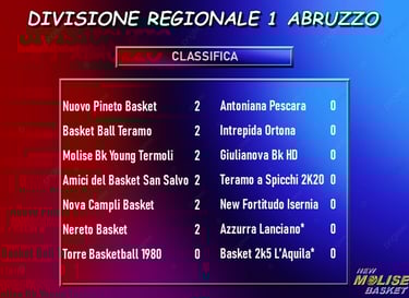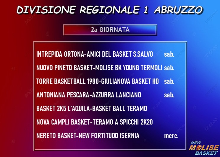 La seconda giornata della Divisione Regionale 1 propone alle due squadre molisane partecipanti sfide parecchio impegnative. Sia la Molise Basket Young Termoli sia la New Fortitudo Isernia, infatti, scenderanno in campo in trasferta, rispettivamente a Pineto e Nereto, contro due quintetti usciti entrambi con due punti dalle rispettive gare della prima giornata.