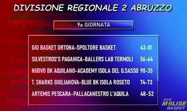 Molisani al comando insieme allo Spoltore, si diceva. Nessun problema, infatti, per l'altra capolista nella gara in trasferta ad Ortona, portata a casa con ampio scarto. Ko, invece, per la terza formazione che alla vigilia di questa giornata si trovava in testa alla graduatoria: la Blue Basket Isola Roseto, infatti, cede di un solo punto in casa dei Tiger Sharks Giulianova, che con questo successo raggiungono Paganica a quota 10 punti in compagnia del Nuovo Basket Aquilano, che rispetta i pronostici e batte ampiamente l'Academy Isola del Gran Sasso. Successo in trasferta, infine, per la Pallacanestro L'Aquila sull'Artemis Pescara. Prima dell'inizio del girone di ritorno il calendario prevederebbe una settimana di riposo, ma - come detto - ci saranno da giocare i tre recuperi che ancora mancano per considerare effettivamente concluso il girone di andata: Nuovo Basket Aquilano-Ballers Lab Termoli e Paganica-Ortona sabato 24 gennaio, Giulianova-Pallacanestro L'Aquila domenica 25.