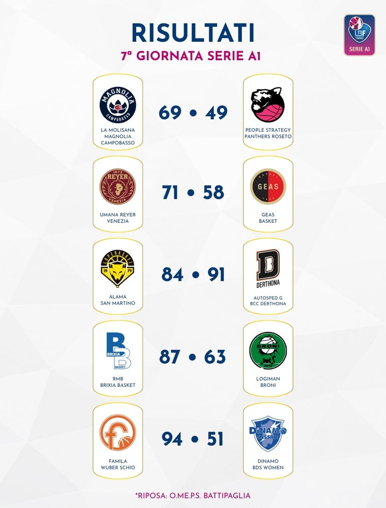 Per quanto riguarda le altre gare della settima giornata, resta tutto immutato in testa alla classifica, con Schio che supera agevolmente in casa Sassari e Venezia che batte al Taliercio Sesto San Giovanni con allungo nel secondo tempo. Dietro alla Magnolia, ora terza da sola, c'è lo stesso Geas e poi la coppia formata da Broni e Sassari, con la squadra lombarda sconfitta in maniera inaspettatamente netta sul campo del Brixia Basket, che coglie due punti importantissimi - i primi della sua stagione - e risucchia in fondo alla graduatoria Roseto e Battipaglia, ferma per il turno di riposo. Lasciamo per ultimo il match fra San Martino e Derthona, che ha visto la squadra piemontese prevalere grazie al sorpasso avvenuto nella seconda metà del quarto periodo dopo essere stata in svantaggio (anche in doppia cifra) per lunghissimi minuti nel corso del match: decisivi tre o quattro errori consecutivi di San Martino sotto il suo tabellone, errori che hanno consegnato alle avversarie facili canestri da sotto che alla fine sono risultati decisivi per l'esito della contesa.