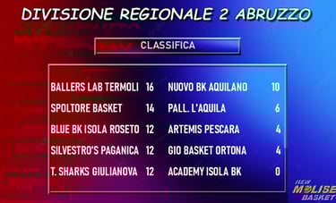 La Ballers Lab Termoli vince il suo secondo recupero sul campo del Nuovo Basket Aquilano e chiude il girone di andata al primo posto solitario, imbattuta in trasferta in questo campikonato. Otto vittorie, infatti, sulle nove gare giocate, con l'unico ko arrivato alla seconda giornata contro lo Spoltore, che peraltro in classifica è la più immediata inseguitrice dei molisani. I risultati dei recuperi sono i seguenti: