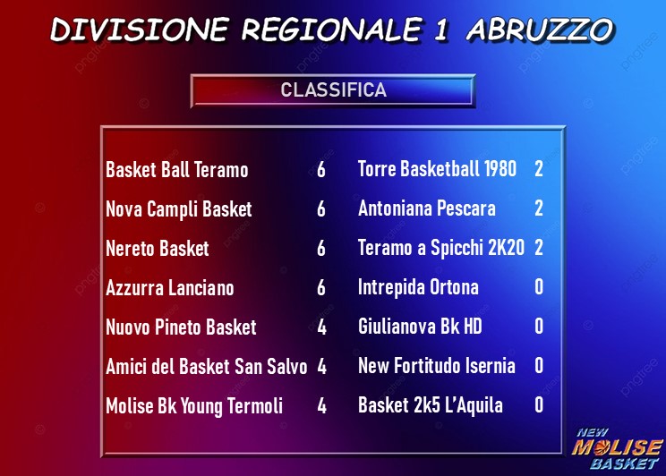 Restano in quattro al comando della classifica, con Campli e Lanciano che vincono con pochi problemi rispettivamente contro Torre e Giulianova e Basket Ball Teramo e Nereto che fanno propri i due big match della giornata, i teramani contro Pineto e i neretesi a San Salvo. Pineto, così, resta a quota 4 punti e, insieme alla stessa San Salvo , è raggiunta dalla Molise Basket Young Termoli. A due punti Torre, Pescara e Teramo a Spicchi, che coglie il priomo successo stagionale contro Ortona. A zero punti, oltre ad Ortona ed Isernia, ci sono anche Giulianova e L’Aquila