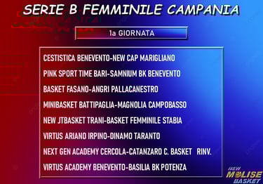 Nella foto qui sotto, di proprietà di Magnolia Basket, vedete alcune delle ragazze impegnate nel torneo di serie B, mentre nell'immagine successiva trovate il quadro completo delle gare in programma in questa giornata d’esordio; da segnalare il fatto che una di esse, e cioè Next Gen Cercola-Catanzaro, è stata rinviata e si giocherà il prossimo 14 ottobre.