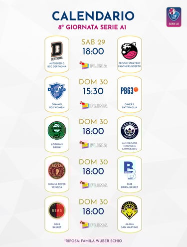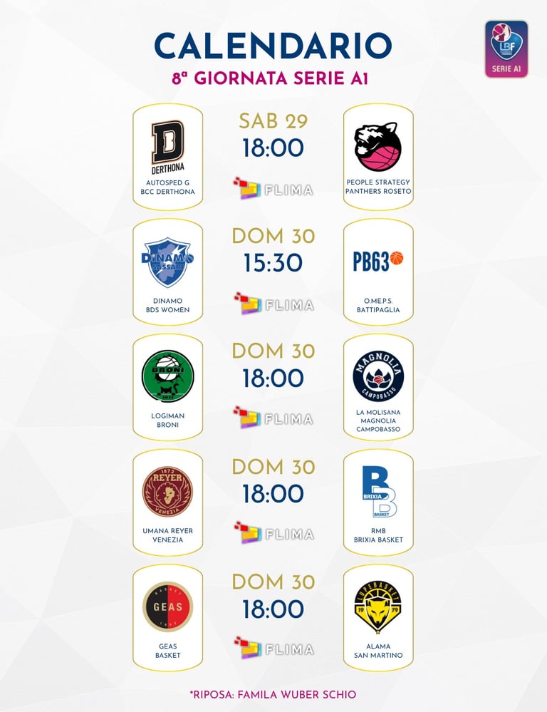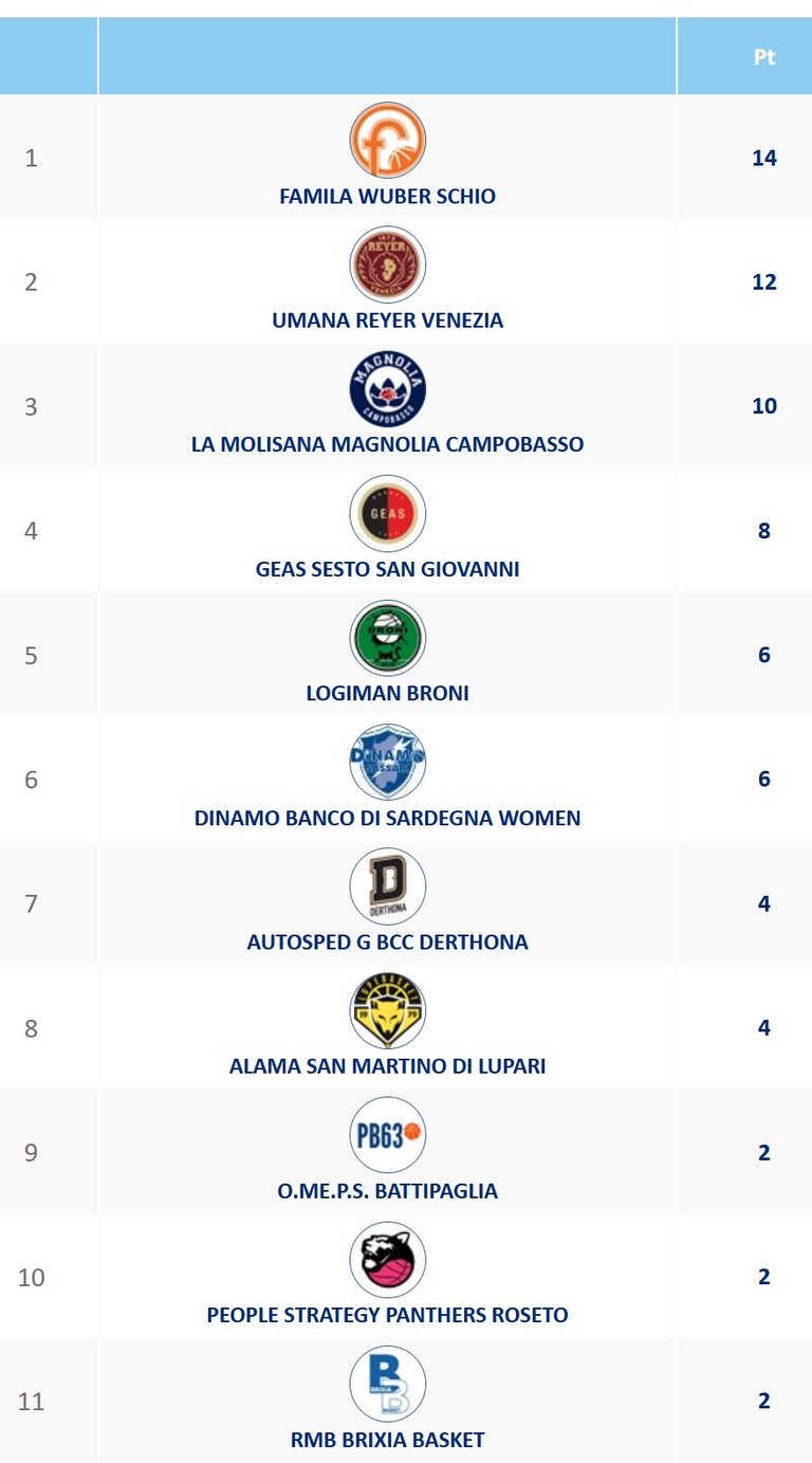 La corazzata Schio osserva il turno di riposo e quindi la Reyer ha l’occasione di operare l’aggancio provvisorio al comando dovendo ospitare un’avversaria sulla carta inferiore come Brescia, che però va in laguna con il morale alto dopo aver trovato i primi due punti della stagione in un modo molto convincente. Geas San Martino è la gara più interessante della giornata, con le milanesi che però in questo momento della stafgione appaiono abbastanza nettamente più in forma delle venete, reduci peraltro dal “suicidio” (perche di questo si è trattato) contro Derthona nell’ultimo match disputato. Derthona che ospita Roseto nell’unica gara in programma oggi, seconda trasferta consecutiva di sabato per le abruzzesi. CHiude il quadro delle gare in programma la sfida del primo pomeriggio fra Sassari e Battipaglia, sperando che al Palaserradimigni l’impianto elettrico sia tornato a posto dopo lo sciagurato giovedì di coppa.