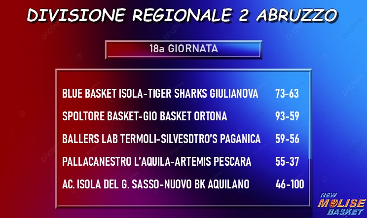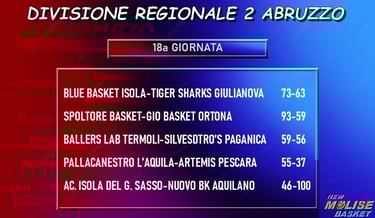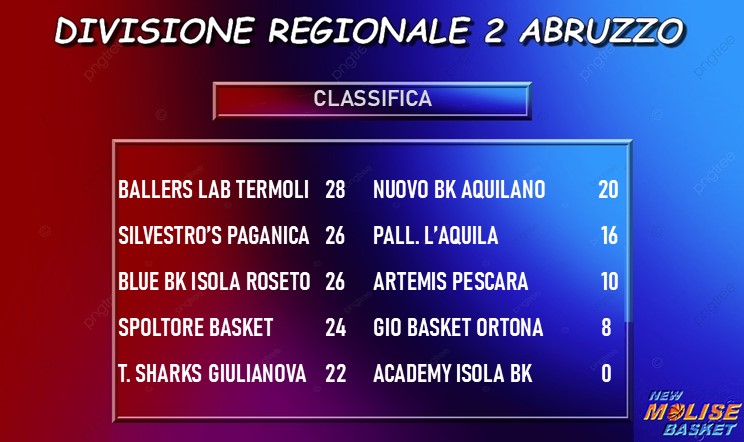 Combatte la Ballers Lab Termoli, rischia di subire la terza sconfitta consecutiva ma alla fine batte una tenacissima Silvestro’s Paganica e conquista il primo posto al termine della fase di andata e ritorno del campionato di Divisione Regionale 2, avendo così il vantaggio - nella fase ad orologio - di giocare in casa le due gare contro la seconda e la terza classificata e in trasferta le due contro l’ultima e la penultima. Ma soprattutto i termolesi conquistano il 2-0 negli scontri diretti con gli aquilani, cosa che potrà essere fondamentale nella definizione della griglia dei playoff, ricordando che per eventuali arrivi in parità da regolamento si terrà conto solo degli scontri diretti della prima fase del campionato, escludendo quindi quelli della fase ad orologio. Tornando al match fra Ballers Lab e Paganica, la partita è equilibratissima, con le due squadre che ribattono colpo su colpo l’una alle giocate dell’altra e gli ospiti che al termine della terza frazione di gioco sono davanti di cinque lunghezze. Nel quarto periodo, i molisani tirano fuori gli artigli e chiudono la saracinesca in difesa, concedendo all’avversaria di mettere solo altri otto punti a referto ed operando il sorpasso che li conduce all'importantissima vittoria.