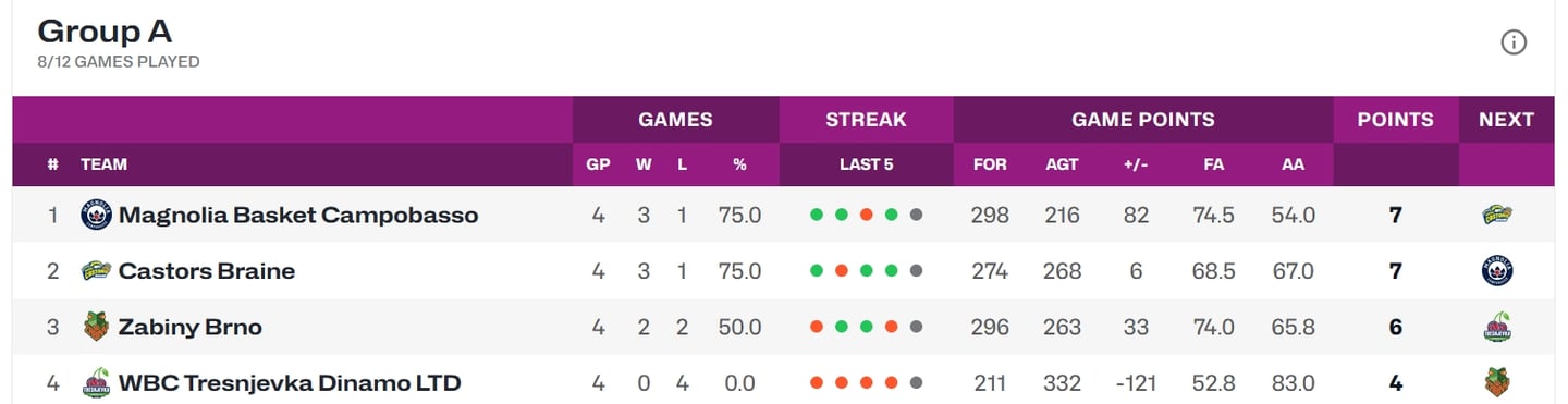 Come prevedibile, la Magnolia Campobasso torna alla vittoria anche in Eurocup battendo di 26 punti il Tresnjevka di Zagabria, la squadra che a tutti gli effetti fino a questo momento ha dimostrato di essere la meno attrezzata del gruppo A. IUn Tresnjevka che a La Molisana Arena fa vedere di essere molto migliorato rispetto alla gara di andata, nella quale le campobassane avevano maramaldeggiato, tornando dalla Croazia con 52 punti di vantaggio.