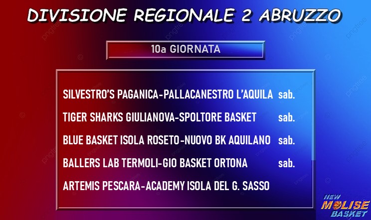 L’unica squadra finora capace di battere la Ballers Lab è stata lo Spoltore, che comincia la seconda metà del torneo in trasferta sul difficile campo dei Tiger Sharks Giulianova, che dopo le prime nove giornate sono soltanto due punti indietro rispetto all’avversaria. Una sfida interessante è anche quella fra Blue Basket Roseto e Nuovo Basket Aquilano, mentre più sbilanciate a favore delle rispettive formazioni di casa appaiono quelle fra Silvestro’s Paganica e Pallacanestro L’Aquila e - unica in programma domenica - fra Artemis Pescara e Academy Isola del Gran Sasso.