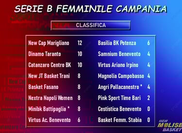 Giocate due delle tre gare da recuperare nel campionato di serie B femminile. Curiosamente, entrambe le partite sono state disputate a Benevento, in due palasport diversi. Nel recupero del match rinviato alla quinta giornata, la Napoli Women Basketball ha battuto la Cestistica Benevento per 65-42; nel recupero dell'incontro rinviato alla seconda giornata, invece, Battipaglia ha superato la Samnium Benevento col punteggio di 70-55. Nell'immagine sopra potete vedere la classifica aggiornata. Resta ira da disputare un'ultima gara di recupero, quella fra la stessa Battipaglia ed Angri, sospesa sempre alla quinta giornata a causa del forte colpo alla testa subito da una giocatrice battipagliese, infortunio poi fortunatamente risolto senza ulteriori problemi per la stessa giocatrice. Il giudice sportivo ha disposto la ripetizione di questa partita, per la quale - però - non è ancora stata fissata una data.