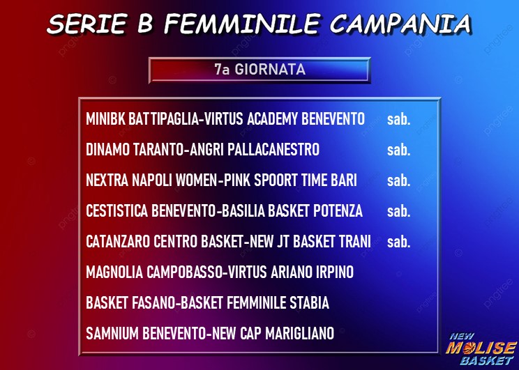 Non c’è un vero e proprio big-match nella settima di campionato. L’incontro più interessante sembra essere quello fra Catanzaro e Trani, con le calabresi che vogliono continuare nella loro rincorsa alla vetta della classifica e le pugliesi che non sono certo una squadra remissiva. Non male sulla carta nemmeno Battipaglia-Virtus Benevento, in cui le battipagliesi cercano la vittoria che le lancerebbe verso le posizioni “nobili” della classifica, considerato che hanno ancora una partita da recuperare. Per il resto, sono in programma diversi testacoda: la capolista solitaria Marigliano va a far visita ad un Samnium Benevento che dopo il buon inizio di campionato sembra adesso un quintetto in crisi, mentre Taranto, Fasano e Napoli Women hanno i favori del pronostica rispettivamente contro Angri, Stabia e Bari. L’ultimo incontro in programma è quello fra Cestistica Benevento e Potenza, con le sannite a caccia della prima vittoria e il quintetto di Antonio Paternoster che cerca punti importanti per rimanere fuori dalla zona playout.