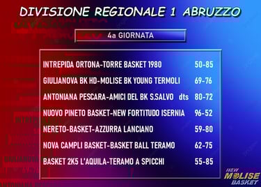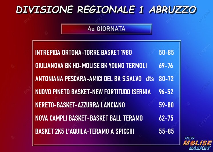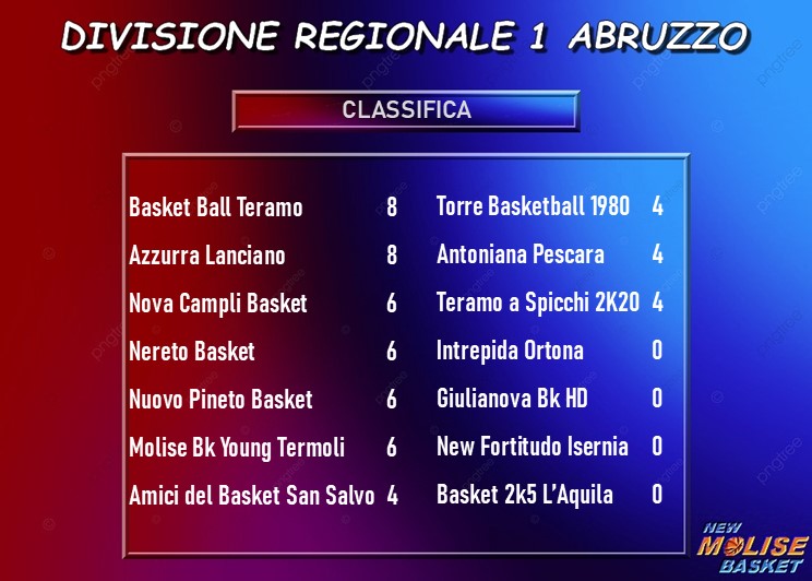 Col successo di Giulianova, la Molise Basket Young si mantiene nel gruppetto delle immediate inseguitrici del duo di testa. Sì, perché dopo la quarta giornata il drappello delle squadre che alla vigilia guidavano la classifica si è dimezzato, con Lanciano e Basket Ball Teramo vincitrici, peraltro entrambe in trasferta, dei rispettivi big match contro Nereto e Campli. Le quali, dunque, vengono agguantate con un bilancio di tre vittorie ed una sconfitta, oltre che da Termoli, anche dal Pineto. Resta a quota 4 punti San Salvo dopo la sconfitta in overtime sul campo dell’Antoniana Pescara, che raggiunge gli Amici del Basket insieme a Teramo a Spicchi, vincente a L’Aquila, e Torre de’ Passeri, corsaro ad Ortona. Le stesse L’Aquila e Ortona fanno compagnia ad Isernia e Giulianova a zero punti.