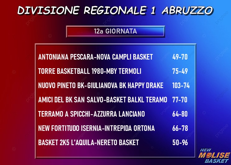 Non si ferma la corsa dell’Azzurra Lanciano in testa alla classifica. Il quintetto frentano resta a punteggio pieno dopo dodici giornate battendo in trasferta Teramo a Spicchi con la consueta autorità. Alle sue spalle, c’è ora il terzetto Campli-Nereto-Pineto, tutte e tre vincenti nel fine settimana, con i farnesi corsari a Pescara, Pineto che supera i 100 con Giulianove e Nereto che ci va vicino a L’Aquila. Sorprende in parte, infine, la sconfitta del Basket Ball Teramo a San Salvo.