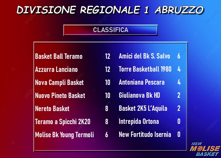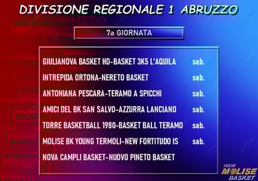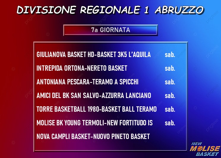 Sono impegnate in trasferta le due squadre che comandano la classifica a punteggio pieno: il Basket Ball Teramo va a giocare a Torre de’ Passeri, mentre l’Azzurra Lanciano è ospite degli Amici del Basket San Salvo. Due gare non facili per teramani e lancianesi, che tuttavia hanno in entrambi i casi il pronostico dalla loro parte. Il big match del settimo turno è però quello fra Campli e Pineto, scontro fra i due quintetti che si dividono la terza posizione in graduatoria. Nereto e Teramo a Spicchi, che seguono a ruota, hanno dunque nel mirino l’aggancio a una delle due, ma dovranno prima portare a casa le loro rispettive gare in trasferta contro Ortona ed Antoniana Pescara. L’ultimo match in programma è quello fra Giulianova Happy Drake e Basket 2k5 L’Aquila.