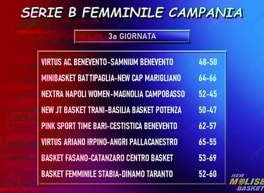 Va al Samnium Benevento il derby cittadino con la Virtus dopo un match concluso con soli due punti di distacco fra l’una e l’altra squadra; così come di due punti è l’affermazione di Marigliano sul campo del Battipaglia, mentre di tre è quella di Trani su Potenza. Insieme a Marihgliano, resta in testa a punteggio pieno anche Taranto, che vince a Castellammare lasciando al palo l'avversaria odierna, così come al palo resta Angri, sconfitta nella trasferta di Ariano Irpino. Prima vittoria in campionato per Bari, che infligge la terza sconfitta consecutiva alla Cestistica Benevento, e, infine, continua la marcia di Catanzaro, che vince il suo secondo match a Fasano e nel recuperò di martedì contro la Napoli Women conta di essere la terza formazione a punteggio pieno diopo tre giornate di campionato.
