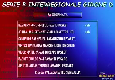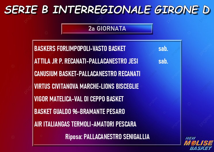 Visti i risultati della giornata d’apertura, la sfida più interessante del secondo turno potrebbe essere quella fra Porto Recanati e Jesi, derby marchigiano che permetterà (anche alla squadra di casa) di verificare se il quarantello rifilato una settimana fa a Val Di Ceppo è frutto dell’effettiva grande forza dell’Attila o magari di una squadra umbra che nello scorso turno ha giocato molto al di sotto delle sue possibilità; di fronte “ai portuali” la formazione jesina, anch’essa reduce da una vittoria alla prima giornata e alla ricerca di una conferma. Dicevamo di Val di Ceppo, che punta al riscatto ma va in trasferta a testare l’esordio in campionato di Matelica, la scorsa settimana a riposo. “Stuzzicanti” dal punto di vista dell’interesse anche i match fra Civitanova Marche e Bisceglie, con i padroni di casa vogliosi di fare due su due dopo la vittoria di Pescara e i pugliesi… anche, per fare un altro passo verso l’eliminazione del segno meno dal numero dei loro punti in classifica. Ugualmente con motivi di interesse sono le sfide fra Gualdo e Pesaro, la prima sconfitta di misura e la seconda largamente vincente all’esordio, e fra Canusium e Recanati, entrambe reduci da vittorie all’overtime nella prima giornata; chiude il quadro delle gare in programma Forlimpopoli-Vasto, con gli abruzzesi vogliosi di riscatto dopo la maratone perdente di sette giorni fa e i romagnoli alla ricerca di una prestazione che faccia dimenticare la pesante sconfitta di Pesaro. Riposa la Pallacanestro Senigallia.