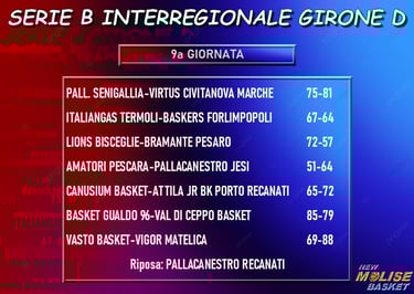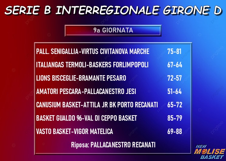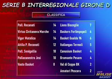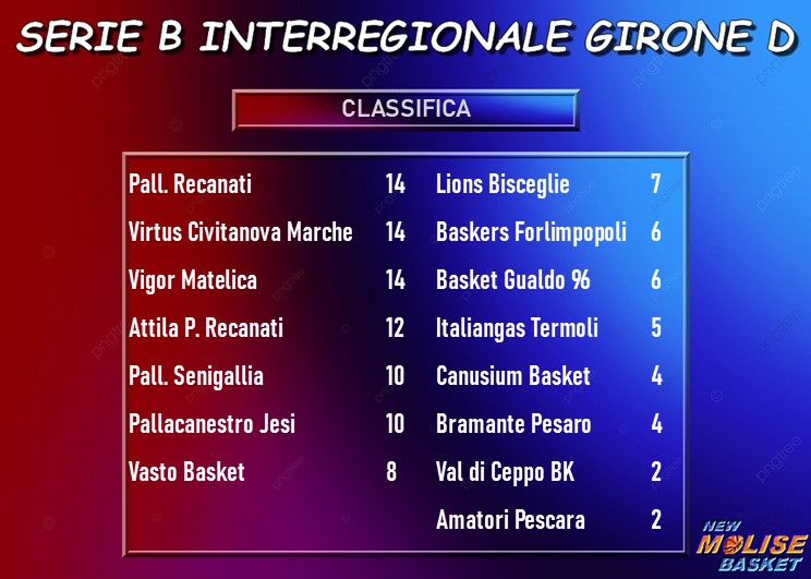 Con la capolista (ora non più) solitaria ferma per il turno di riposo, adesso sono in tre a guidare la classifica, perché - per l’appunto - Recanati è agguantata da Civitanova Marche e Matelica, vincenti rispettivamente a Senigallia e Vasto. Alle spalle del terzetto, avanzano anche Porto Recanati dopo il successo sul difficile campo del Canusium Basket e Jesi, che agguanta Senigallia vincendo a Pescara. Ora Vasto è incalzata da Bisceglie, che continua a risalire la china dopo la partenza ad handicap con 5 punti di penalizzazione battendo abbastanza agevolmente Pesaro. Più in basso, Gualdo agguanta Frolimpopoli superando in casa Val Di Ceppo nel derby umbro, seguono Termoli e le coppie Canusium-Pesaro.e - in ultima posizione - Val Di Ceppo-Pescara.