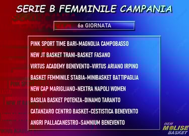 La gara più importante della sesta giornata sembra essere quella fra Marigliano e Napioli Women, con la capolista che riceve un team che ha rinviato la sua partita infrasettimanale e dunque, al contrario dell’avversaria, ha avuto tempo per preparare questo match; Taranto prova a restare al passo andando ad affrontare Potenza in una gara sulla carta più abbordabile rispetto a quella della diretta rivale. Molto interessante anche il derby pugliese fra Trani e Fasano, mentre Catanzaro sembra avere sulla carta vita più facile ospitando la Cestistica Benevento. Con il morale alto dopo le buone notizie sulla sua giocatrice infortunata, Battipaglia affronta la trasferta di Castellammare di Stabia; chiudono il quadro delle partite in programma le sfide fra Angri e Samnium Benevento, con le sannite che cercheranno di chiudere il loro momento no, e fra le due Virtus, Benevento ed Ariano Irpino.
