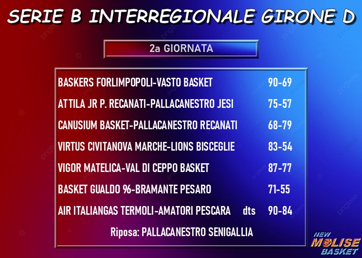 Nonostante il perdurare delle assenze di Grimaldi e Magugliani, ma con Rupil regolarmente in campo dopo il forfait della prima giornata, l'Italiangas Termoli conquista i primi due punti della stagione superando l'Amatori Pescara, a sua volta priva di Dervishi, dopo un tempo supplementare, dimostrando grande carattere nel recuperare uno svantaggio che all'inizio del quarto periodo era di otto lunghezze, con Pescara che sembrava avere in mano la situazione ed essere in grado di conquistare la vittoria in trasferta.