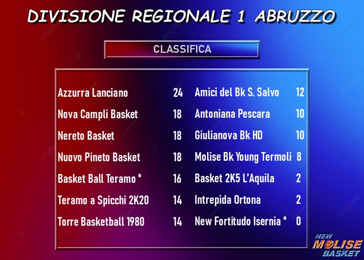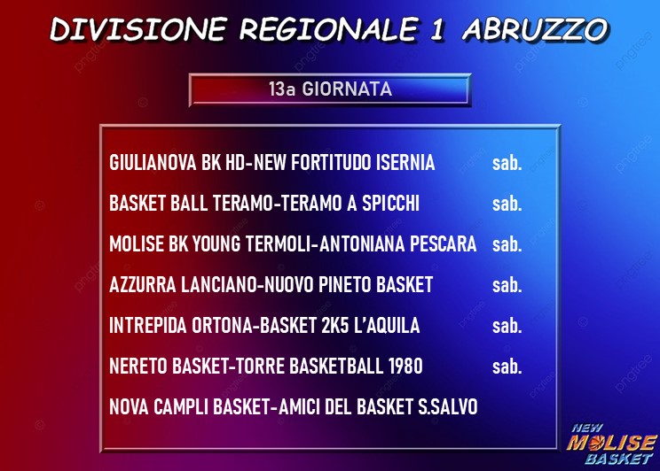 Per quanto riguarda le altre gare in programma, l’Azzurra Lanciano cercherà di tenere immacolata la casella delle sconfitte in campionato nel match casalingo - non facile - contro Pineto, una delle squadre che occupano la seconda posizione in graduatoria. Più agevole sulla carta il compito delle altre due seconde, con il Campli impegnato in casa contro San Salvo e il Nereto che ospita il Torre Basketball. In attesa di conoscere ufficialmente il “destino” della gara dell’undicesima giornata contro Isernia (sul sito Fip non compare né il 20-0 né una data per l’eventuale recupero), Il Basket Ball Teramo gioca il derby cittadino, per il calendario in casa, con Teramo a Spicchi.L’ultimo match in programma è quello fra Basket 2k5 L’Aquila ed Intrepida ortona, che consentirà ad una delle due di sopravanzare l’altra nei punti in classifica.