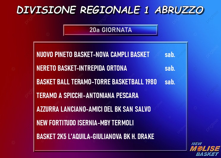 Con la capolista Azzurra Lanciano che affronta in casa San Salvo con grandi possibilitàò di proseguire nella corsa a punteggio pieno e Nereto e Basket Ball Teramo che sono anch’esse sulla carta favorite rispettivamente contro Ortona e Torre (ma occhio a quest’ultima, pericolose anche per le squadre che le stanno sopra in classifica), l’incontro più interessante è quello fra Pineto e Campli, sfida che mette in palio il quarto posto in classifica. Teramo a Spicchi-Antoniana Pescara e Basket 2k5 L’Aquila-Happy Drake Giulianova sono le ultime due gare in programma.