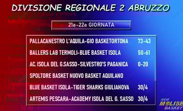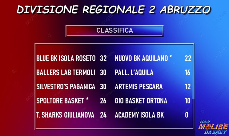 Seconda sconfitta consecutiva per la Ballers Lab Termoli, che lascia i due punti alla Blue Basket Isola, che effettua il sorpasso in classifica ed ora è la grande favorita per concludere la regular season in pole position, oltre che - a questo punto - per la vittoria del campionato, anche se - come spesso accade - nei playoff ogni pronostico può essere sovvertito. La speranze di primato per i termolesei, in realtà, non sono del tutto tramontate, ma passano attraverso la nexcessità che la Blue Basket perda la gara di giovedì contro Giulianova, cosa che permetterebbe alla Ballers Lab, con una vittoria domenica prossima controp Ortona, di concludere la regular season a pari merito con gli "isolani" e riprendersi il primato in quanto in vantaggio negli scontri diretti ndella fase di andata e ritorno (da regolamento, le partite della fase ad oirologio non contano nel computo degli scontri diretti). Dato il momento di gran forma della Blue Basket, riteniamo però che una sua sconfitta contro gli "squali tigre" sia abbastanza improbabile.