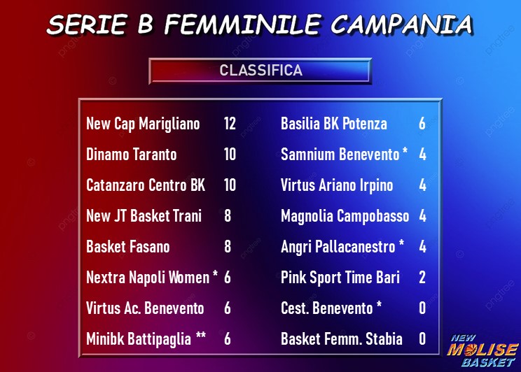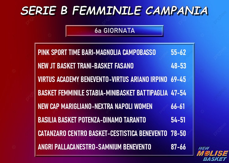 Taranto subisce la prima sconfitta in campionato sul campo del Potenza e Marigliano, vincente nel big match con la Napoli Women, resta da sola al comando della classifica, con la formazione jonica che viene raggiunta al secondo posto da Catanzaro, vincente come da pronostico sulla Cestistica Benevento. Una coppia pugliese a quota 8 punti, con Fasano che vince in trasferta lo scontro diretto ed agguanta Trani. Fra le quattro formazioni a 6 punti, oltre a Potenza vincono anche Battipaglia a Castellammare di Stabia, mentre la Virtus Benevento in casa con Ariano Irpino. Quest'ultima squadra viene raggiunta dalla Magnolia e dall'Angri, che supera bene in casa il SAamnium Benevento. Quello di Bari è l'unico quintetto a quota 2, ancora senza vittorie Castellammare e Cestistica Benevento.