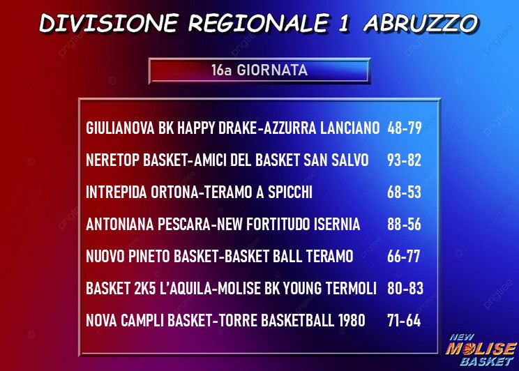 Lanciano non conosce ostacoli e, conquistando a Giulianova l’ennesima vittoria, mantiene i sei punti di margine su Campli, vittorioso contro Torre, e Nereto, che supera San Salvo in una gara dal punteggio alto. Perde, invece, Pineto, superata in casa dal Basket Ball Teramo, che in attesa del recupero di giovedì contro Isernia aggancia l’avversaria odierna. Si “smuovono” le acque nella seconda metà della classifica, con Pescara che raggiunge San Salvo e Torre e Termoli ed Ortona che avanzano dopo le rispettive vittorie, quella ortonese un po’ a sorpresa contro Teramo a Spicchi.