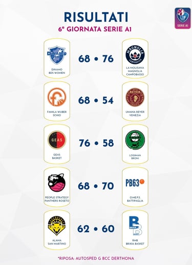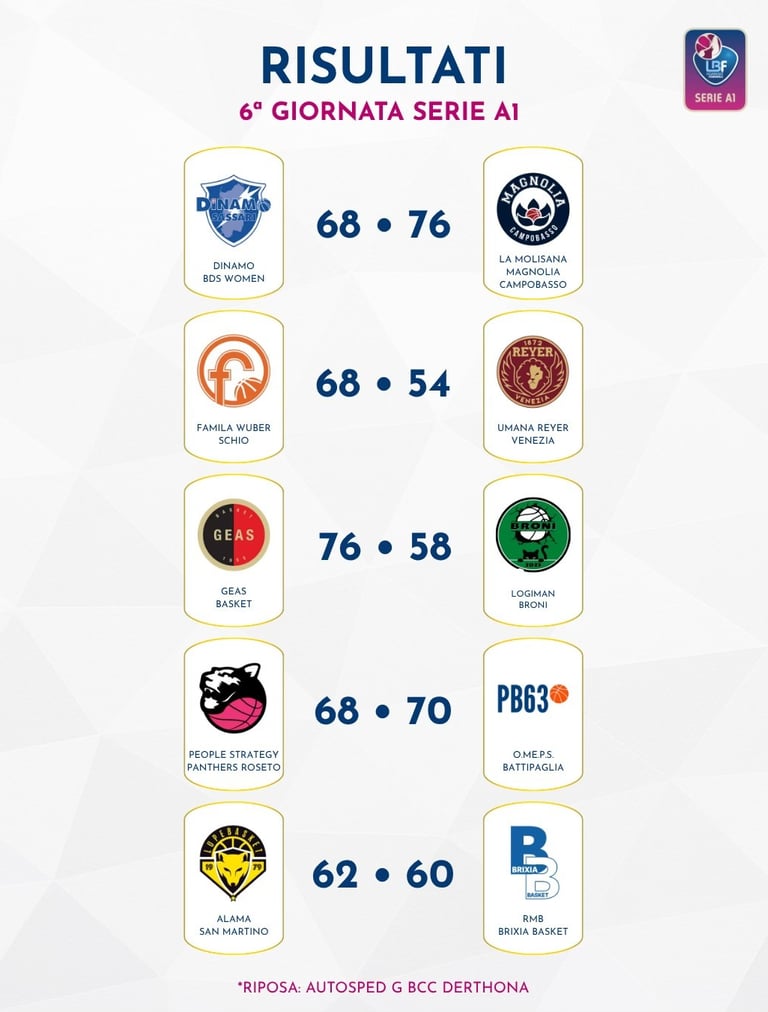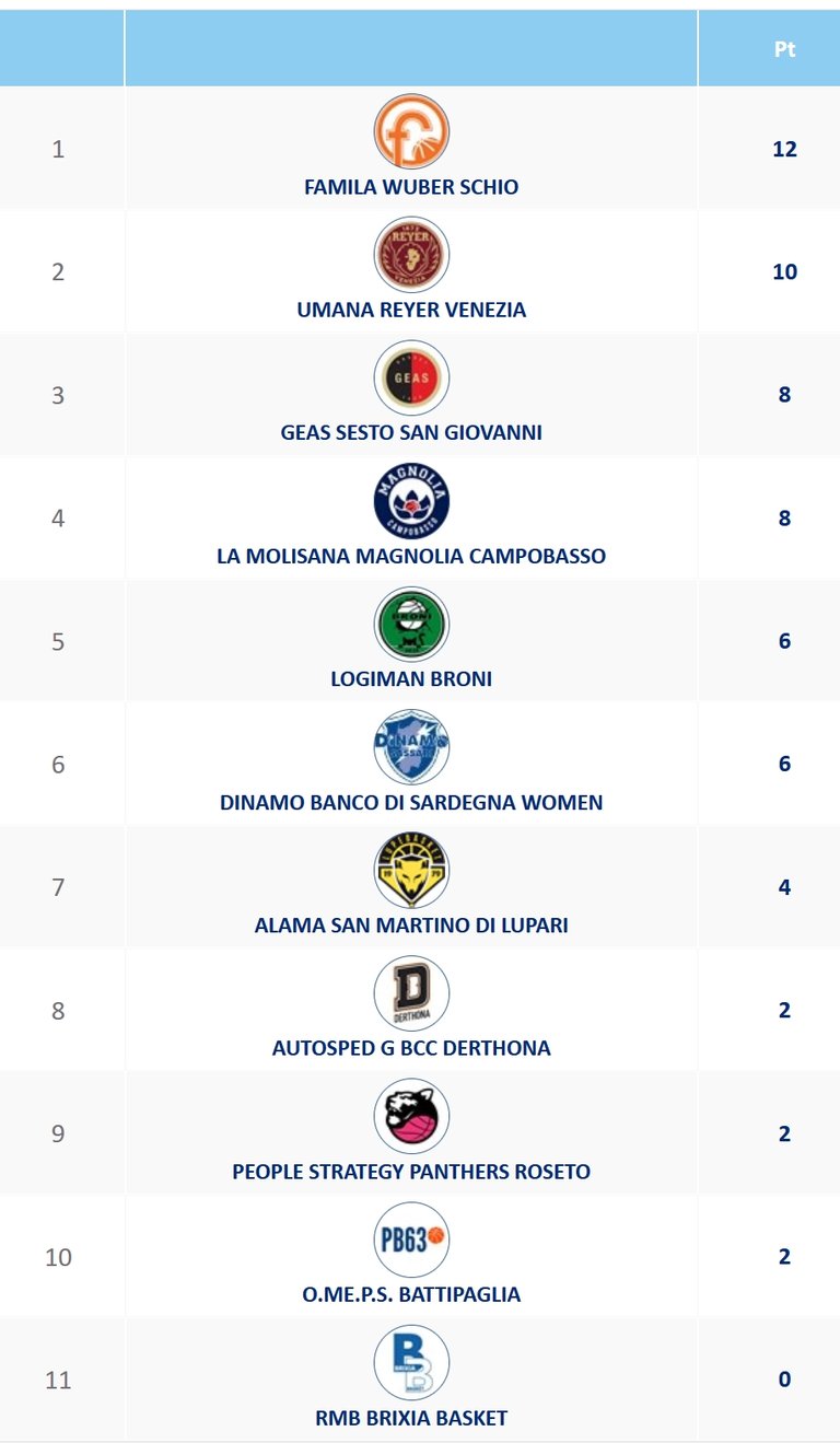 Il big match fra le due corazzate del campionato va a Schio, che nonostante le assenze di Zandalasini e Sottana batte una Venezia che non può contare sulle prestazioni di Fassina e resta da sola al comando a punteggio pieno. Grazie al successo in Sardegna, e grazie alla vittoria netta di Sesto San Giovanni Su Broni, Magnolia e Geas avvicinano la Reyer, che ha 10 punti contro gli 8 della coppia lombardo-molisana, con Broni e Sassari che restano ferme a 6 punti. Avanza in classifica anche San Martino di Lupari, che fa suo praticamente sulla sirena finale il confronto con una Brixia che mostra segni di crescita ma esce sconfitta anche dalla tana delle Luupe. Primo successo, infine, per Battipaglia, che va a vincere a Roseto e si schioda da quota zero, ora appannaggio della sola Brixia. Ha riposato Derthona.
