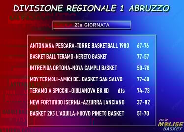 Vittoria fondamentale per la Molise Basket Young Termoli, che supera di nove lunghezze gli Amici del Basket San Salvo e, tenendo conto del -1 della gara di andata, conquista il vantaggio negli scontri diretti, vantaggio che potrà essere decisivo in caso di arrivo in parità al termine della regular season per evitare i playout. Un match combattuto, con i termolesi che prendono un piccolo vantaggio al termine del primo quarto, portano il divario in doppia cifra nel secondo e tengono bene le distanze con l’avversaria nel terzo, resistendo altrettanto bene nell’ultima frazione per portare a casa la fondamentale vittoria. Nulla da fare come da pronostico, invece, per la New Fortitudo Isernia, che - opposta alla capolista schiacciasassi Lanciano - resta sotto nel punteggio fin dalla palla a due.