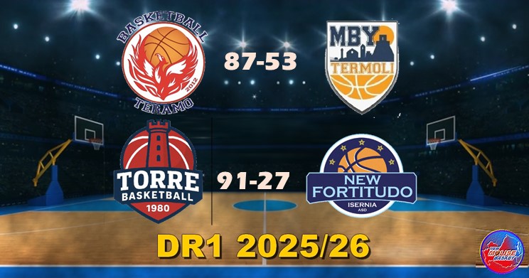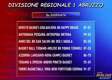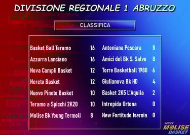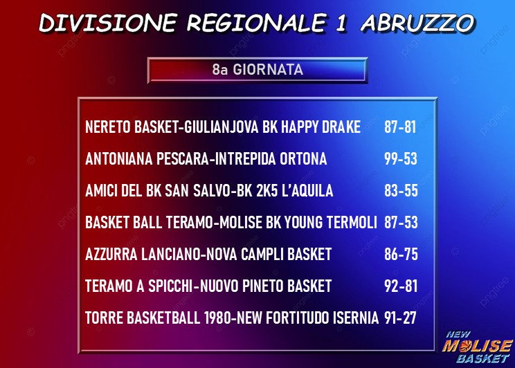 Due pesanti sconfitte per le squadre molisane nell’ottava giornata del torneo di Divisione Regionale 1. La Molise Basket Young Termoli resiste bene per due quarto sul campo del basket Ball Teramo ma subisce nella terza frazione l’urto della squadra di casa, che chiude i conti sul 64-40 del trentesimo minuto e tiene senza problemi nell’ultimo periodo. La New Fortitudo Isernia, invece, affronta la trasferta di Torre de’ Passeri con soli sette giocatori e non arriva mai a segnarne 10 in nessuna delle quattro frazioni di gioco, con i padroni di casa che comandano le operazioni fin da subito e portano a casa i due punti senza difficoltà.