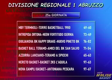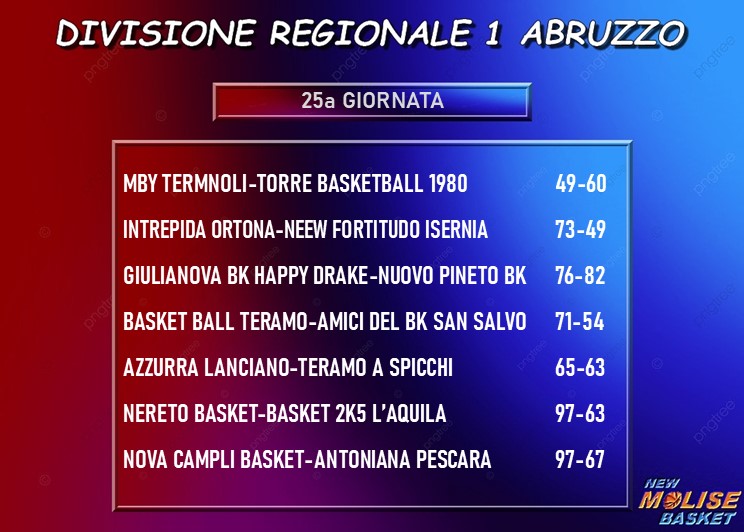 Manca una sola giornata al termine della regular season e - se Lanciano ormai da tempo ha indirizzato la sua stagione a centrare la promozione nei playoff e vince con fatica la sua ennesima partita - c’è lotta per la seconda posizione fra Nereto, Basket Ball Teramo e Campli, tutte e tre vincitrici delle rispettive partite contro L’Aquila, San Salvo e Pescara. Con Nereto e Teramo che in settimana recupereranno i match con le due molisane, la conquista della piazza d’onore appare essere una questione fra queste due formazioni. Pineto vince a Giulianova e tiene il passo delle squadre che le sono davanti, Torre e Pescara sono tranquille in zona playoff, mentre Giulianova e Teramo a Spicchi si giocheranno nel prossimo turno l’ultimo posto utile all’ingresso nella post season per la promozione, così come Termoli e San Salvo sono le due formazioni in lizza per evitare i playout, ai quali sono già certi di partecipare Ortona, L’Aquila e Isernia.