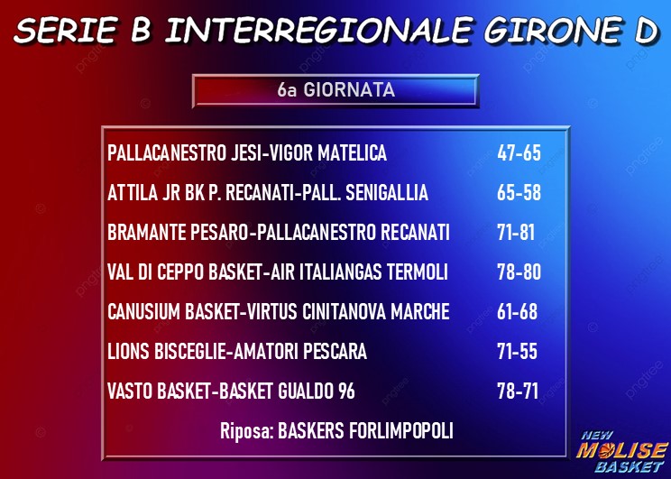 Prosegue la corsa a tre in testa alla classifica; fra le battistrada, quella che “vince meglio” è senza dubbio Matelica, che lascia dolo 47 punti alla Pallacanestro Jesi e piazza il ventello (o quasi) in trasferta; ma Recanati e Civitanova Marche non sono da meno andando a vincere su campi difficili rispettivamente a Pesaro e Canosa. Successo importante, poi, per Porto Recanati su Senigallia. Prosegue la risalita di Bisceglie, che in casa non perde un colpo e batte anche l’Amatori Pescara, unico quintetto ancora senza vittorie in campionato. Buon successo, infine, per Vasto du Gualdo. Ha riposato Forlimpopoli.