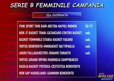 Già disputato un incontro di questa ventiduesima giornata, con la Napoli Women che è andata a vincere in casa della Pink Bari: precisando che la classifica che vedete nella seconda immagine NON è aggiornata con l’esito di questa partita, nella prima immagine ne potete vedere il risultato esatto. Fra le gare che completeranno la settima di ritorno, spicca quella fra Trani e Catanzaro, con le pugliesi che non sono in un grande periodo di forma e la capolista che può approfittarne ma deve affrontare questa partita in trasferta. L’altra prima in classifica,Marigliano, ha invece un impegno decisamente più agevole contro la Samnium Benevento. Fasano affronta Stabia in trasferta e un’altra sfida molto interessante è quella che mette di fronte Angri e Taranto. Sbilanciate a favore delle rispettive squadre di casa, infine, sono Potenza-Cestistica Benevento e Virtus Benevento-Battipaglia.