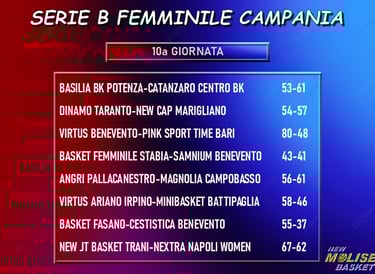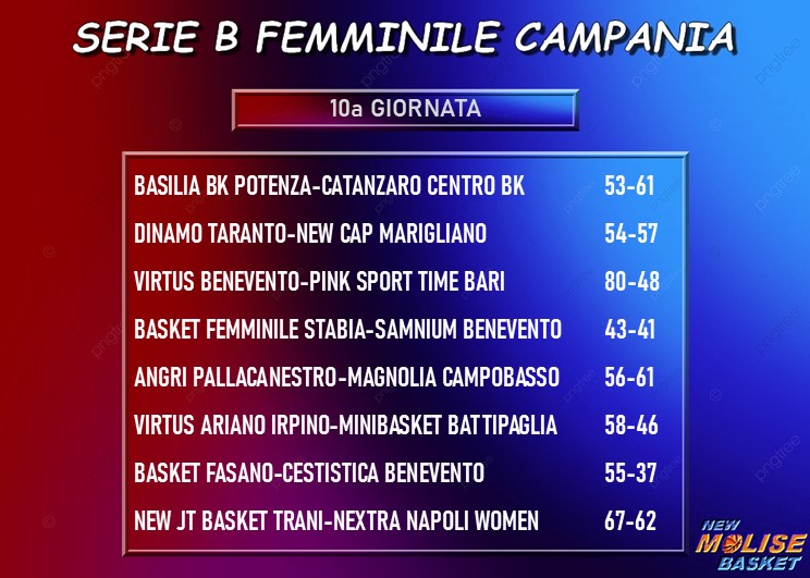 Torna a vincere Marigliano sul difficile campop della Dinamo Taranto e mantiene i due punti di vantaggio in classifica su Catanzaro, a sua volta vincente nell'anticipo giocato mercoledì 19 sul campo della Basilia Potenza, e Fasano, che supera in casa il fanalino di coda Cestistica Benevento. Ferme tante squadre che viaggiano nella metà di sinistra della graduatoria: sconfitte, infatti, oltre ad Angri e Taranto, anche la Napoli Women Basketball sul campo del Trani, che insieme alle due Virtus, Benevento ed Ariano Irpino, vincitrici rispettivamente su Bari e Battipaglia, agguanta le succitate Angri e Taranto. Bel passo in avanti della Magnolia, che si lascia alle spalle una Samnium Benevento in caduta libera, battuta ed agguantata dallo Stabia.