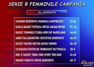 In questa quattordicesima giornata registriamo la mancata disputa del match fra Catanzaro e Battipaglia a causa della rinuncia della formazione campana, come si legge da un comunicato stampa apparso sui social della società calabrese. Il match, dunque, è stato omologato col 20-0 a favore di Catanzaro, che con questo due punti tiene il passo delle due battistrada, entrambe vittoriose. Marigliano, infatti, si riscatta dopo il ko casalingo con Angri andando a vincere sul campo dello Stabia, mentre Fasano fa suo con scarto sorprendentemente ampio il big match contro la Napoli Women. Le partenopee restano indietro rispetto a Trani, che vince come da pronostico contro Bari, e vengono raggiunte da Virtus Benevento, corsara a Taranto, ed Angri, che supera la Cestistica Benevento. Vittoria, infine, per Potenza su Ariano Irpino.