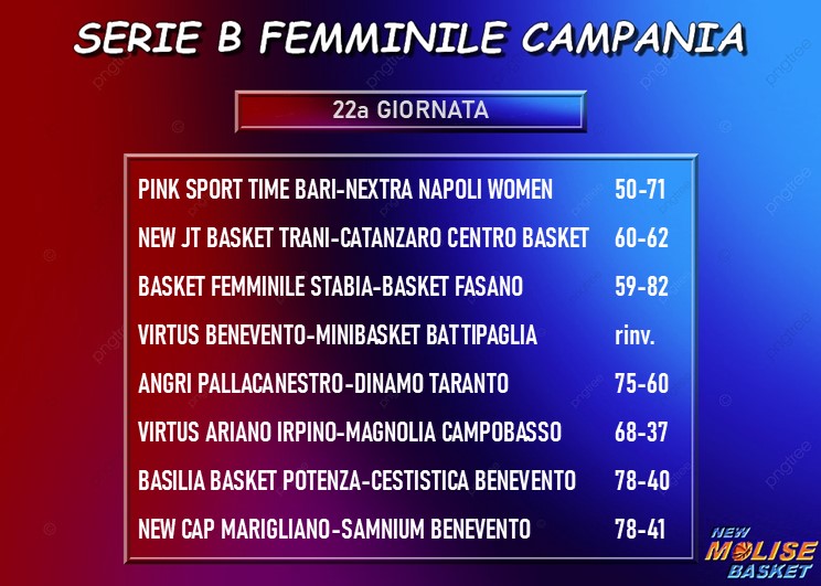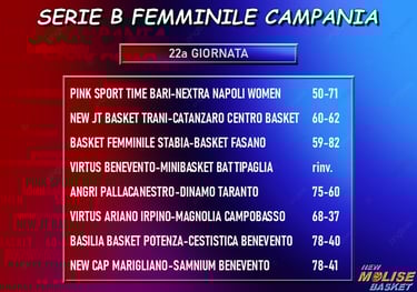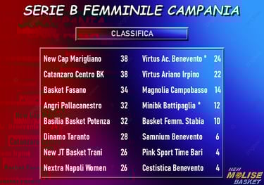 Come si diceva, la sconfitta non crea sconvolgimenti di classifica. In attesa del risultato di Battipaglia - la cui gara in trasferta con la Virtus Benevento è stata rinviata al 3 marzo - vanno ko tutti i quintetti che sono dietro alle campobassane, con - in ordine inverso di classifica - la Cestistica Benevento che esce battuta dal parquet di a Potenza, Bari che perde in casa con Napoli nel match giocato venerdì, Samnium Benevento che cede sul campo della capolista Marigliano e Stabia che non riesce ad opporre una valida resistenza al Fasano di Alessia Vitali. In testa, Marigliano va a braccetto con Catanzaro, che vince di misura a Trani nel primo dei due match più importanti della giornata. Segue Fasano staccata di quattro punti dalla vetta, e - altri due punti più indietro - la coppia Angri-Potenza, con le campane che fanno proprio il match casalingo contro Taranto, il secondo dei due più importanti della giornata. Manca molto al termine della regular season, ma le prime cinque posizioni sembrano abbastanza appannaggio delle cinque formazioni appena citate; si lotta, invece, per gli altri tre posti nei playoff, con Taranto che precede quello che al momento è il duo Trani-Napoli ma che virtualmente è un terzetto, perché la Virtus Benevento - due punti più indietro - deve ancora giocare la sua partita, con Ariano Irpino che al momento è fuori ma spera ancora di riuscire ad agguantare una posizione nella griglia dei playoff.