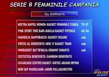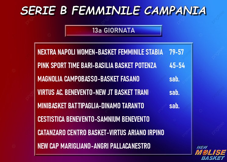 Già disputate due gare in questa tredicesima giornata: si tratta di Napoli Women-Stabia, terminata 79-57, e Bari-Potenza, conclusa col punteggio di 45-54. Per il resto, il calendario propone due sfide interessanti, come i match fra Marigliano ed Angri e fra Catanzaro ed Ariano Irpino. In programma, poi, Battipaglia-Taranto e, infine, l’ennesimo derby beneventano fra Cestistica e Samnium. ATTENZIONE: la classifica qui sotto non tiene conto delle due gare già giocate in questa tredicesima giornata.