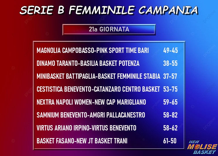 Vincono le prime in classifica, con Catanzaro e Marigliano che tengono la testa superando rispettivamente Cestistica Benevento e Napoli Women, e Fasano che segue a ruota dopo aver battuto Trani nel big match della giornata. Bene anche Angri, che passa con largo scarto sul campo della Samnium Benevento, mentre si ferma la corsa della Dinamo Taranto dopo la sconfitta casalinga contro un Potenza che invece nelle ultime settimane sembra aver ingranato la quinta. Con le rispettive vittorie, Angri e Fasano tengono il passo delle squadre di alta classifica e lasciano indietro Taranto e Trani. Avanza anche la Virtus Benevento dopo il successo esterno ad Ariano Irpino, mentre nella metà di destra della graduatoria, la Magnolia fa un bel passo avanti verso la salvezza diretta e prende due punti anche Stabia, che vince bene a Battipaglia.