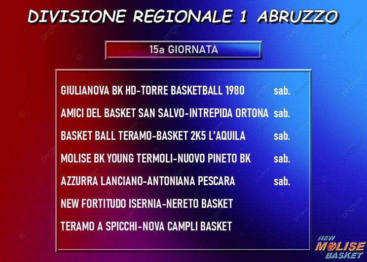 Il calendario della seconda di ritorno prevede due gare parecchio difficili per le formazioni molisane di Divisione Regionale 1. Impegni… “in rima”, infatti, contro Pineto e Nereto rispettivamente per la Molise Basket Young Termoli e la New Fortitudo Isernia. Due avversarie che si trovano nelle zona altissime della graduatoria, alle spalle della dominatrice assoluta Azzurra Lanciano. Fra le due, Nereto è messa leggermente meglio, essendo seconda a quota 22 punti insieme al Campli, mentre Pineto è posizionata immediatamente dietro la suddetta coppia avendo due punti in meno. Per come sono messe in classifica le due formazioni della nostra regione, al momento il primo turno dei playout le metterebbe l’una di fronte all’altra ma Termoli è in una posizione che può ancora permetterle di evitare la post season e salvarsi direttamente dopo la regular season.