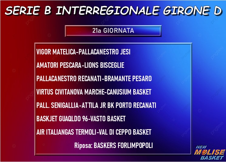 La sesta giornata di ritorno ha l’insolita particolarità di essere la prima completamente domenicale di questo campionato, prevedendo tutti gli incontri in programma nella giornata festiva. La capolista Porto Recanati ha un impegno difficile sul campo di Senigallia, mentre Civitanova Marche, la più immediata inseguitrice, ne ha uno decisamente più agevole - almeno sulla carta - ospitando il Canusium. Lo stesso vale per Bisceglie, che sul parquet di Pescara ha l’opportunità di continuare il suo inseguimento alla vetta della classifica. Matelica, nelle ultime giornate decisamente in crisi, cerca il riscatto ospitando la Pallacanestro Jesi e Recanati riceve Pesaro in un match non facilissimo. La sfida fra Gualdo e Vasto è l’ultimo match in calendario.