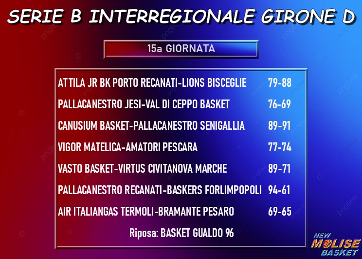NOTE: Tiri da due: Termoli 18/31 (58%), Pesaro 6/21 (29%). Tiri da tre: Termoli 6/19 (32%), Pesaro 14/33 (42%). Tiri liberi: Termoli 15/24 (63%), Pesaro 11/17 (65%). Rimbalzi: Termoli 40 (Diarra 12), Pesaro 19 (Panichi 5). Assist: Termoli 6 (Pierucci 2), Pesaro 6 (Centis 3). Palle perse: Termoli 12, Pesaro 4. Palle recuperate: Termoli 4, Pesaro 12. Cinque falli: Rupil Del Risco (Termoli). Progressione punteggio: 14-16, 18-21, 22-14, 15-14.