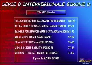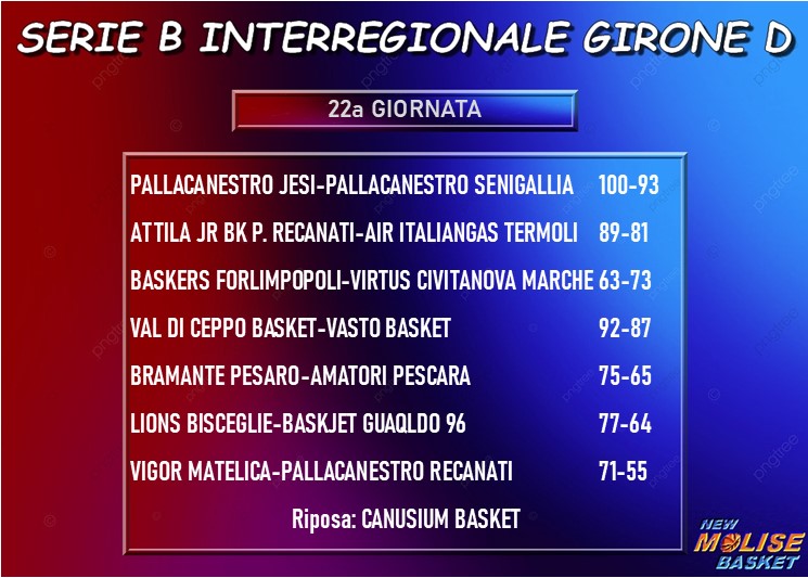 Con il successo contro i termolesi, Porto Recanati tiene il passo di Civitanova Marche, che va a vincere a Forlimpopoli. La coppia di testa continua ad essere incalzata da Matelica, che batte Recanati ed allunga la crisi dell’avversaria, che non rischia di uscire dalla griglia dei playoff solo perché le squadre che si trovano dall’ottava posizione in giù sembrano andare molto a rilento. Come ad esempio Vasto, che aveva un’ottima occasione per avanzare ma la spreca andando a perderew sul campo di Val di Ceppo. Tornando alle zone alte della graduatoria, riscatto di Bisceglie con la vittoria non senza qualche patema su Gualdo, mentre va ko e viene “risuperata” dai Lions Senigallia sul campo dello Jesi. La sconfitta nelle Marche, infine, provoca un danno tutto sommato minimo all’Italiangas Termoli, che viene superata solo da Pesaro dopo la vittoria di quest’ultima nello scontro diretto con Pescara.