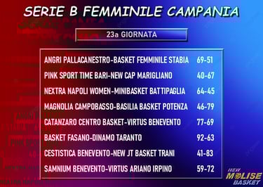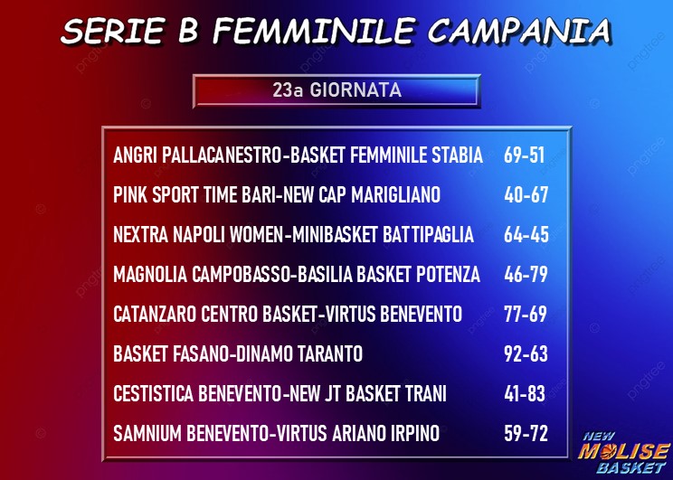 Continua la marcia a due in testa alla classifica, con Catanzaro che supera bene la Virtus Benevento e Marigliano che va a vincere a Bari. Fasano tiene il passo superando in casa Taranto e lo stesso fanno - anche se due punti più indietro rispetto alle brindisine - Angri e Potenza, con la formazione campana che nell’anticipo di venerdì aveva superato sul parquet di casa lo Stabia. Trani vince sul campo della Cestistica Benevento e Napoli batte Battipaglia, con la coppia “appulo-partenopea” che raggiunge in classifica Taranto. Ariano Irpino, infine, va a vincere a Benevento contro la Samnium. Tutte ferme - ottima cosa per la Magnolia - le squadre che in classifica occupano le posizione che vanno dalla dodicesima in poi.