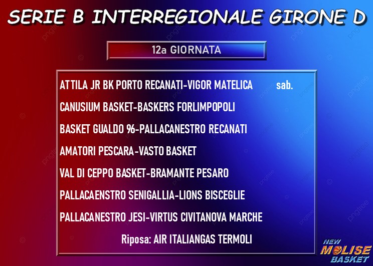 La gara più importante è senz’altro quella che si giocherà a Porto Recanati, dove la squadra di casa torna in campo a sua volta dopo il turno di riposo ricevendo la capolista Vigor Matelica, reduce dall’aver conquistato il primato solitario in graduatoria battendo la scorsa settimana in un altro big match la Virtus Civitanova Marche, quintetto che si trova in seconda posizione ed è impegnato a sua volta nella seconda trasferta consecutiva sul non facile campo della Pallacanestro Jesi. I civitanovesi condividono la piazza d’onore con la Pallacanestro Recanati, che viaggia alla volta di Gualdo Tadino per affrontare un team galvanizzato dalla vittoria di Termoli ma che sulla carta è sfavorito contro i marchigiani. Molto interessante si presenta il match fra Senigallia e Bisceglie, una squadra che senza i cinque punti di penalizzazione sarebbe lassù in alto a battagliare con le primissime della classe e che dopo qualche titubanza di inizio stagione da un po’ di partite a questa parte sembra aver ingranato la quinta. Gli ultimi due match in programma sono entrambi molto importanti per la zona playout, con Canosa che ospita Forlimpopoli e Val di Ceppo che riceve Pesaro.