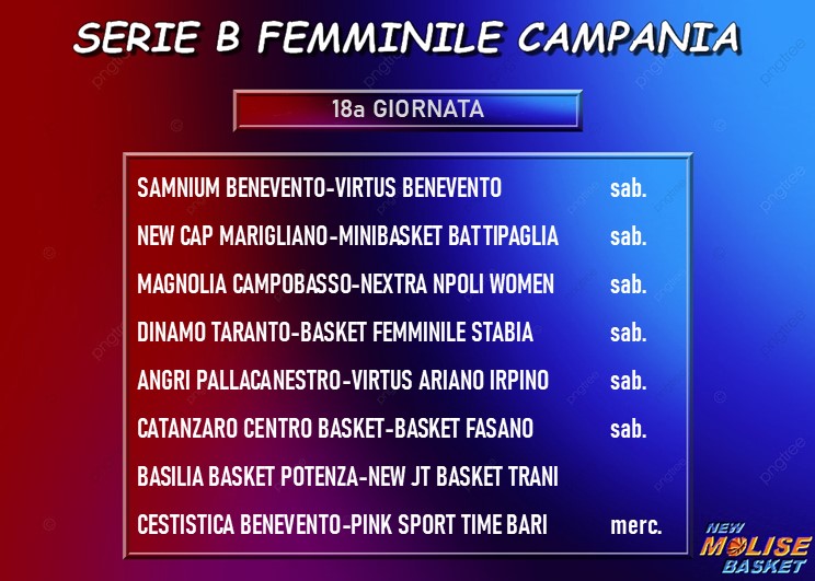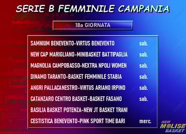 Catanzaro-Fasano è decisamente la gara più importante della terza di ritorno, con le calabresi lanciate in prima posizione (anche se in compagnia di Marigliano) e le pugliesi che devono uscire dal momento no di due sconfitte consecutive che è costato loro il primato solitario. L’altra capolista - Marigliano - ha invece un compito sulla carta agevole contro una Battipaglia in netta crisi. impegni piuttosto complicati per le due quarte in graduatoria, con Angri che riceve la visita di Ariano Irpino e Trani che va sul difficile campo della Basilia Potenza. Taranto e Virtus Benevento sono favorite rispettivamente contro Stabia e Samnium Benevento, l’ultimo incontro in calendario - anche dal punto di vista cronologico - è la sfida clou per le zone basse della classifica fra Cestistica Benevento e Pink Sport Time Bari, posticipata a mercoledì 28 gennaio.